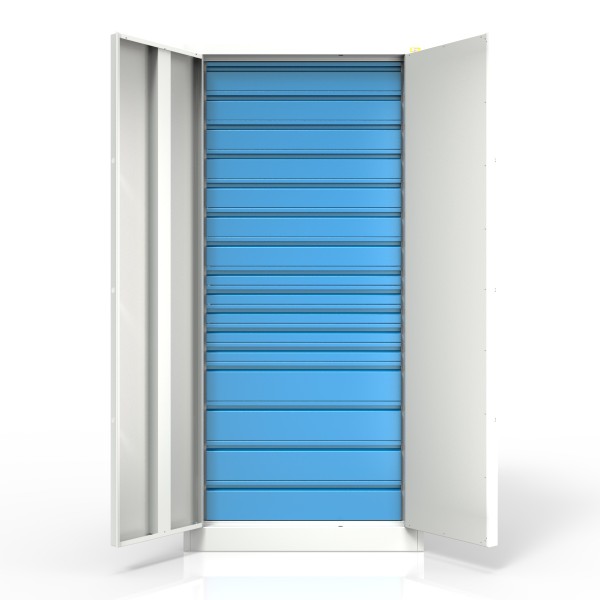Szafa biurowa 2-drzwiowa z 16 szufladami. Szafa posiada dwa skrzydła drzwi uchylnych zawieszone na zawiasach kołkowych wyposażone w zamek klasy A ryglujący w trzech punktach.