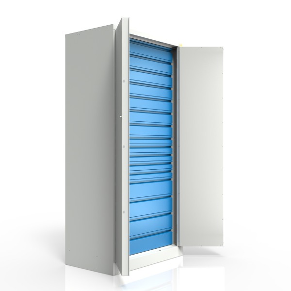 Wyposażona jest w 16 szuflad (4x140mm, 5x65mm, 7x100mm) o wysuwie 450mm i nośności 70kg. Wykonana z blachy czarnej o grubości 0.6mm- 1,5mm, malowana farbami proszkowymi (epoksydowo-poliestrowymi).